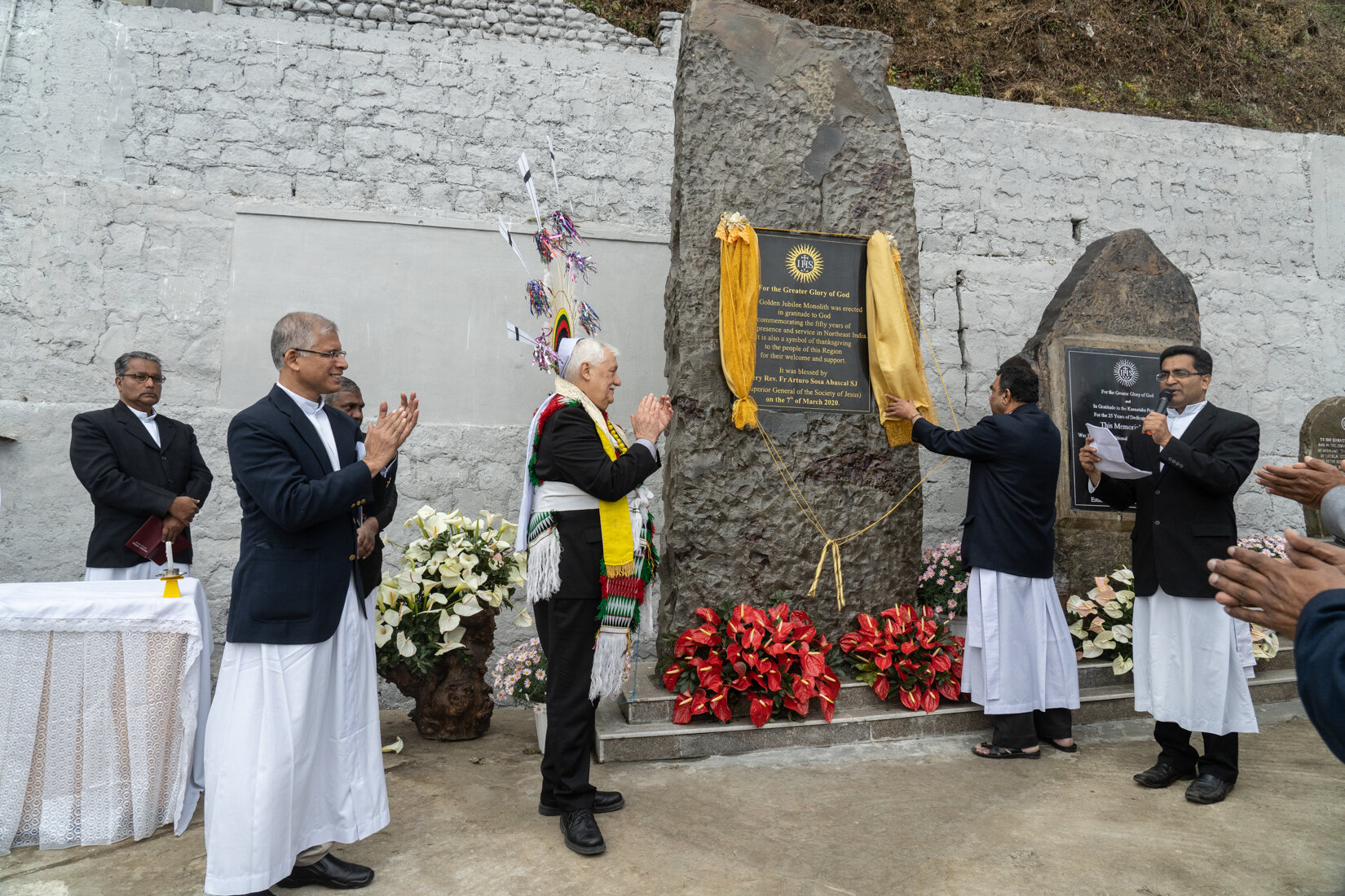 The Golden Jubilee of the Kohima Jesuits. Rev. Fr. Arturo Sosa, Abascal, SJ. is the main Celebrant. 7 March 2020 at Loyola School, Jakhama. Fr; Melvil Pereira, SJ, Mission Superior & Fr. Sosa lead the procession to the entrance of Loyola School.